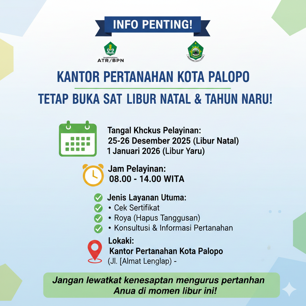 PALOPO – Kabar gembira bagi masyarakat yang ingin mengurus sertifikat tanah di penghujung tahun. Berbeda dari instansi pada umumnya, Kantor Pertanahan (Kantah) Kota Palopo membuat gebrakan dengan teta...